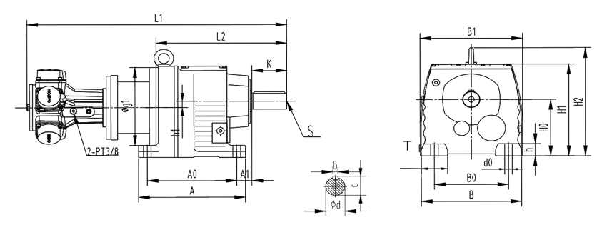 | Modelo de produto | L1 | L2 | A0 | A | B0 | B | B1 | H0 | H1 | H2 | A1 | h1 | T | d0 | h | Parte final axial | ||||
